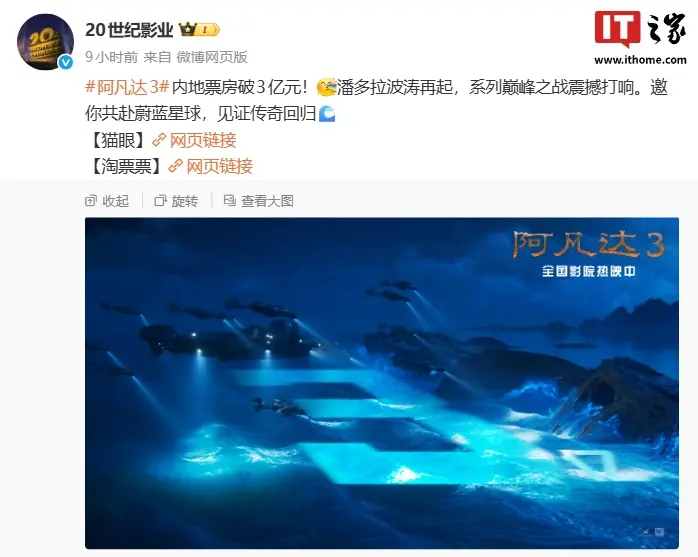 IT之家 12 月 21 日消息,20 世纪影业官方微博昨日宣布,科幻电影《阿凡达 3》内地票房破 3 亿元(截至发稿,累计票房已达 3.37 亿)。